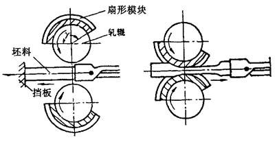 | 释义 | 辊锻 8.2.1.1 辊锻的实质、特点及分类 1.实质 辊锻是通过装有扇形模块的一对轧辊的旋转运动,借助型槽产生塑性变形,从而获得所需形状尺寸的锻件的轧制—锻造复合工艺.其工作过程示意如图8-13所示.辊锻与一般模锻不同,一般模锻的工作行程是直线运动,而辊锻是旋转运动;与轧制也有差别,轧制的轧辊整个圆周都是工作部分,而辊锻只是扇形模这部分工作.