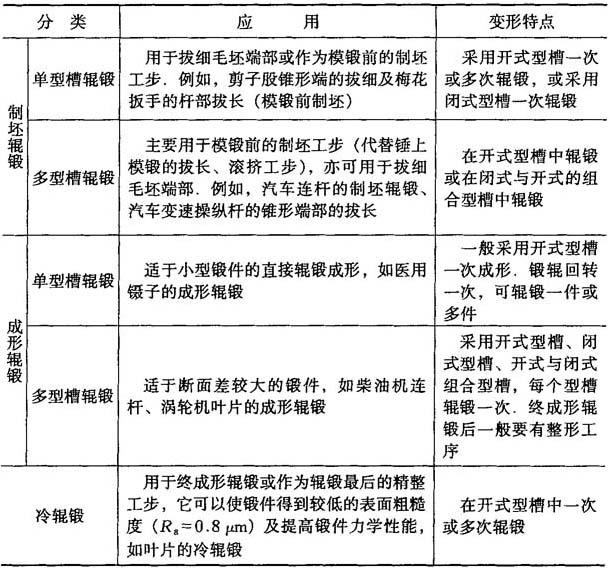 图8-13 辊锻工作过程 辊锻的实质是毛坯的连续拔长变形过程,毛坯在高度方向压缩后,除一小部分金属横向流动而使毛坯宽度略有增加外,大部分金属沿毛坯长度方向流动,横截面积减校长度增加,因此辊锻适用于长轴类、板片类锻件的生产,而对复杂形状锻件如带阻尼凸台的叶片,辊锻难于生产. 2.特点 辊锻工艺是轧制、模锻两种工艺的结合,集中了这两种工艺的优点.辊锻和一般锻造工艺相比具有如下特点: (1)生产率高.在锤上拔长时,往往需打击多次,而在辊锻上由于锻辊是连续运动的,因此只需辊压几次. (2)锻件质量高.具有良好的金属流线,产品精度高,表面粗糙度值校可实现无余量生产,节约金属材料. (3)模具寿命长.由于辊锻变形是连续静压过程,没有冲击与震动,金属与模具表面之间的相对滑动较少,模具磨损校因而模具寿命长,甚至可以不用模具钢,而采用球墨铸铁或冷硬铸铁制造模具,节约模具钢. (4)设备吨位校金属是逐渐连续变形的,变形区校因此所需设备吨位也小. (5)工艺过程简单,劳动条件好.生产过程易于实现机械化、自动化,设备结构简单,对厂房地基条件要求低. 3.分类 辊锻按型槽的作用分为制坯辊锻和成形辊锻;按型槽的数量分为单型槽辊锻和多型槽辊锻;按型槽的形式分为开式和闭式;按变形温度分为热辊锻和冷辊锻. 辊锻的分类、变形特点及应用详见表8-16. 表8-16 辊锻的分类和应用