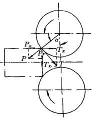 图8-14 锻辊对毛坯的作用力图解 轧辊对金属的作用力分别为总压力P和摩擦力T.将P、T沿水平方向及垂直方向进行分解,得Px、Pz和Tx、Tz.其中Pz、Tz对毛坯起压缩作用,使之产生塑性变形;而Px阻止毛坯进入轧辊;Tx则力图将毛坯曳入辊中.由此只有当Tx>Px时,毛坯端面才能自由咬入.由图得: Pr=Psinα Tx=Tcosα 则毛坯咬入条件为: Tcosα>Psinα 又 式中 f——摩擦系数; β——摩擦角. 故咬入条件可写成: tanβ≥tanα 即 β≥α 由此可见,只有当咬入角小于或等于摩擦角时,毛坯才能自然咬入.接触摩擦是实现辊锻过程的基本条件,摩擦系数越大越有利于咬入. 钢材纵轧时的摩擦系数f与αmax的数值见表8-17.由于辊锻是在型槽中进行的,且多采用中间咬入的形式,因此辊锻的咬入条件大为改善,一般中间咬入角与端部自然咬入角之间的关系为: 表8-17 钢材纵轧时的f与αmax