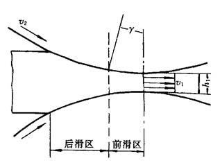8.2.1.2 辊锻的咬入条件及前滑 1.咬入条件 辊锻和轧制一样,实现变形过程的首要条件是能否把毛坯曳入两旋转的轧辊之间,而毛坯的这一曳入过程称为“咬入”.能够实现毛坯曳入的条件即为咬入条件. 毛坯在与旋转轧辊接触时,轧辊对毛坯的作用力如图8-14所示,取其中一个轧辊分析,另一轧辊的作用力情况与之相同.