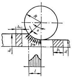 图8-16 变形区中单位压力分布 A=bl 式中 l——变形区长度,mm, R——辊锻模工作半径,mm; △h——压下量,mm; b——变形区平均宽度,mm, 成形辊锻碳钢锻件30钢的平均单位压力见表8-18.当锻件材料为合金时,平均单位压力在参考表8-18的基础上进行修正.制坯辊锻的平均单位压力见表8-19. 表8-18 成形辊锻30钢的平均单位面积压力p均