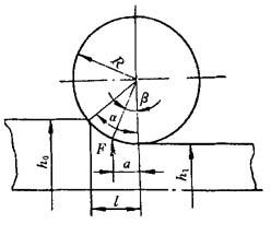 注:材料:50钢;辊锻模直径为500mm;h0、h1分别为辊锻前、后的毛坯高度,单位为mm 2.辊锻力矩的计算 总压力与辊锻力臂之乘积即为辊锻力矩.其计算公式为(见图8-17): M=2Pa (8-10) 式中 P——总压力; a——力臂,总压力作用点至中心连线的距离. 力臂a可表示为: a=φl 式中 l——变形区长度, φ——合力作用点系数,当辊锻件带毛边时φ=0.25~0.30;当辊锻件不带毛边时φ=0.40~0.45.