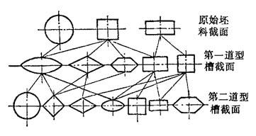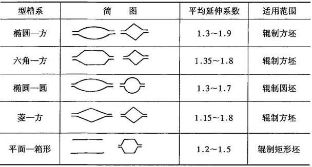 式中 λ总——总的延伸系数, λ平——各道的平均延伸系数,一般取1.3~1.7,对于圆(或方)—椭圆—圆孔型系λ平=1.3~1.5,对于圆(或方)—椭圆—方孔型系λ平=1.5~1.7. 4.型槽系的选择 型槽系的选择参见图8-18及表8-20.辊锻道次如多于两道,可按图示方案重复延续. 表8-20 型槽系选择