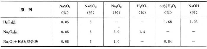 表中:MgSO4和NaiSO3主要作用生成硅酸镁,用来吸收铜(Cu++)和锰(Mn++),使Cu++和Mn++离子失去催化作用。 为进一步防止过氧化物漂剂分解,在漂前要加入螯合剂DTPA(五醋酸二乙撑三胺钠)。 为防止酶对过氧化物的分解,漂前应对纸浆进行C和H段预处理,以抑止酶的分解。
