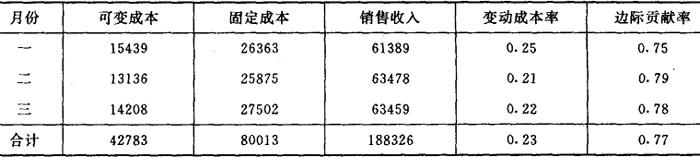 为了解决这一矛盾,车间领导和全体管理人员进行了认真的分析和研究。大家认为,车间经营效果的好坏,主要表现为内部利润的多少;而内部利润的多少,又由销售收入总额的多少和成本的高低这两个主要因素所决定。为了掌握未来的经营效果和目标,需要解决一系列具体问题。如:下个月四车间的盈亏监界点是多少?要使职工奖金达到某一水平,内部利润要完成多少?要取得目标内部利润,目标销售收入又要完成多少?降低单位产品成本的主要手段是什么?要完成下月目标销售收入的具体措施有哪些?等等。 为了解决以上问题,齿轮车间运用量本利分析方法,开展车间经济效果的短期预测,较好地解决了因任务不足而影响车间收入这一实际工作中的主要矛盾。 可见,量本利分析方法在齿轮车间经济核算中的运用,是由于车间内部经济核算的实际需要而引起的。 二、量本利分析的主要作用 1.量本利分析方法可以用来对未来月分的生产经营目标(车间内部销售收入、成本、内部利润、奖金分配等)进行测算,是一种事先的、自觉的科学管理方法。 2.通过量本利分析,改变了过去那种管理人员只关心自己的业务工作、工人只知道干活的被动局面,使全车间职工人人算细帐,个个参与管理,大家都为实现一个目标而努力。 3.车间任务不足,有权承揽外协任务,就需要运用量本利分析法,计算加工这批零件的总的经营成果是多少,不加工这批零件,车间总的经营成果又是多少,为车间决策提供依据。 4.开展量本利分析,有利于提高车间经营管理水平。通过分析,可以找出车间过去经营管理中的主要问题,总结经验,指导今后的工作;同时,还可以制定未来的生产经营指标,使整个生产过程按照目标进行。 三、齿轮车间对量本利分析方法的具体运用 先将齿轮车间1-3个月份实际成本分类(见表2),。并计算边际贡献率(见表3)。 表2 齿轮车间1-3月份实际成本分类表