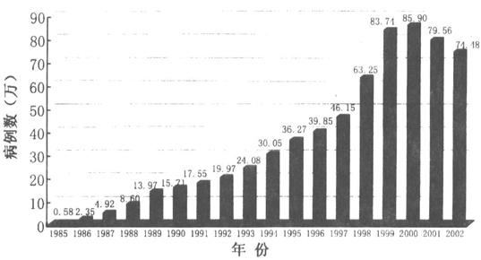 图1-2 我国1985-2002年性病报告病例数
