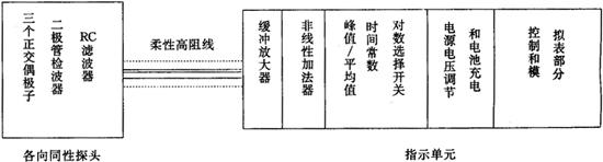 | 释义 | 近区场的测量仪表和校准方法 1.近区场强计 近区场强计是一种测量高电平近区电磁场的设备,主要用于检测漏场和电磁兼容试验。目前近区场强计的频率范围已达100kHz至24GHz,电平测量范围为1~3000V/m。 近区场强计由场强传感器和指示单元及连接两者用的特殊电缆组成。无论是作为场强传感器的接收天线,还是指示单元,都是不调谐的。它的工作原理是在接收天线上将感应的高频电压转变为直流或低频信号,通过特殊的高阻传输线送至指示单元。指示单元是增益不高的直流或低频放大器。 图7.12-1示出一种近区场强计的简单框图。图中的各向同性探头由三个相互正交的偶极子组成,在每个偶极子中心空隙处装有肖特基二极管检波器,检波器的直流输出通过三条高阻双线传输到指示单元。