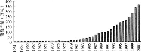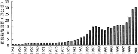 | 释义 | 近年来我国的葡萄栽培面积和产量 根据世界粮农组织(FAO)的统计资料,1999年世界葡萄的年产量为6069万吨,占水果总产量的13.6%,仅次于柑橘,位居世界水果产量第二位。中国的水果产量已位居世界第一位。2001年,中国的葡萄产量已位居各种水果第五位。从图1和图2可以看出,我国20年来的葡萄面积和产量一直处于发展趋势(FAO统计资料)。