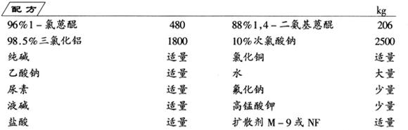 (2)闭环 在钢制滚筒反应器内加入干燥缩合物、三氯化铝、尿素和少量氟化钠。转动反应器进行混合,待排出大量氯化氢气体时(即所谓发泡),用电加热器升温至185~190℃,继续转动反应器至反应完全。用电风扇冷却,将物料用真空吸至已放有水的稀释锅内,在95℃蒸煮1h,冷却至60℃经压滤机过滤,滤饼用水洗至中性。