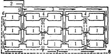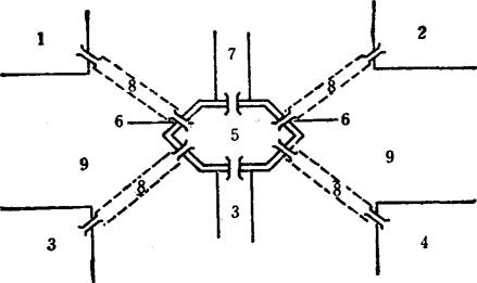 图1-3 放射状干、支渠集水井、分水闸示意图(俯视) 1-4.鱼塘;5.分水井;6.分水闸;7.渠道;8.暗支渠;9.堤顶面 明渠的走向以直线平行于鱼塘的短边为理想,因其长度较短,流速均匀,不易淤积,节支省地。如果渔场地形环境采用明渠不能直行,需要弯曲时,一个办法是建分水井,再一个办法是形成弯曲。明渠弯曲的地方,它的中心线的弯曲形状,一般采取圆形。弯曲半径宜大不宜小,这样可以防止或减少因水流离心力的作用造成对渠道对方岸壁的冲刷及内方发生淤积。 |