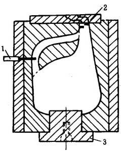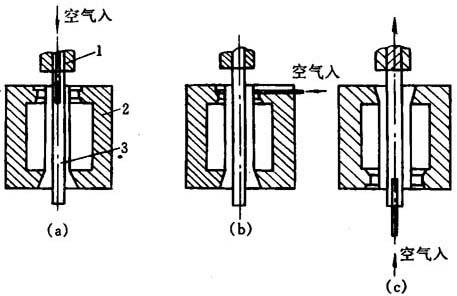 图15-17 三种基本的进气形式 (a)顶吹法 (b)针吹法 (c)底吹法 1-机关 2-模具 3-型坯 (一)针吹法 针吹法也称横吹法,是装在模具的一半爿中的。当模具闭合时,吹针前进,穿破型坯壁,并以压缩空气吹胀型坯,然后吹针缩回。另一种方法是,为了引入吹针,在成品颈部上有一段延长部分,以便吹针插入延伸部分而不致损坏瓶颈。这种方法不只局限于用一根吹针,还可用几根吹针同时吹气,以缩短吹胀时间。针吹法的代表性设计如图15-18。这种方法目前国内较少应用。