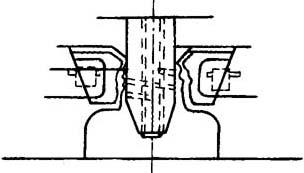 图15-19 兼有定径和切颈作用的顶吹法 顶吹法的优点是可以直接利用机头芯模作为吹气芯轴,压缩空气从机头进入,经芯轴进入型坯,从而简化了吹塑机构。 其缺点是采用本法较难定径(为便于插入型坯中,芯轴都较细)和需要增加颈部修饰工序。而且,压缩空气直接从机头芯模通过,影响机头温度。为此,就得设计与芯模无关的独立的顶吹芯轴。 (三)底吹法 底吹法见图15-20。从机头挤出的型坯,落到模具底部的吹气芯轴上。吹气芯轴的作用除用以吹胀型坯外,还能保证瓶颈尺寸精确。在采用底吹法,在底部的区域内必须提供过量的物料,这就导致瓶颈分模线处形成两个耳状飞边,制品成型后需整饰。 这种吹塑方法适用于口部偏离制品中心的大型容器,如化工包装容器、啤酒桶等,也能用于具有几个开口的容器。 底吹法的缺点是进气口设在型坯温度较低的部位,而且型坯接触吹气芯轴后,温度进一步下降,因此,若在吹气口旁边的制品形状较为复杂时,往往型坯吹胀不够充分,且瓶颈部分耳状飞边修剪后,留有较明显的痕迹,同时容器底部的厚度较大。