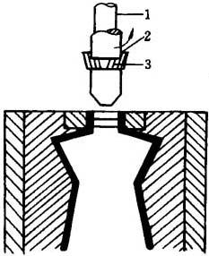 图15-18 针吹法吹针的位置 1-吹针 2-夹口 3-夹 嵌件 针吹法优点是适合连续吹塑颈尾相连的小型容器,而且还可用于内具有切断装置的模具,生产用芯轴吹气不能成型的不带瓶颈的制品。 针吹法的缺点是在开口制品成型后,为了获得合格的瓶颈,需要整饰加工。同时,模具结构也较复杂。因此,与一般的芯轴吹塑相比,模具制造成本高,吹塑过程中压力损失大,只能用于中小型制品的吹塑。 (二)顶吹法 模具闭合时,型坯在底部被夹住而让顶部开口,以使压缩空气从吹气芯轴中通入。较先进的顶吹法是吹气芯轴由二部分构成:一部分是能定颈部内径的芯轴,另一部分是在吹气芯轴上滑动的旋转刀,下降后切除余料,见图15-19。