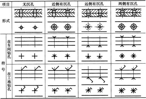 | 释义 | 连接结构图 金属连接结构图是供加工金属结构件时所用的图样。连接是利用铆接或螺栓连接等把两个或两个以上的零件或构件,连接成为一个整体,其图示方法可根据GB4656-84《金属构件表示方法》表示螺栓及铆钉连接结构件。 (一)结构孔的表示方法 表4-22列出了孔的形式及表示符号。在垂直于孔轴线的视图中,孔的形式及符号用粗实线绘制,但不可见线条仍为细虚线表示,且中心处不得有圆点;在平行于孔轴线的视图中,采用细实线表示孔的轴线,其余符号均为粗实线。 表4-22 孔的形式及表示符号
