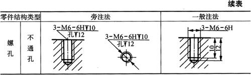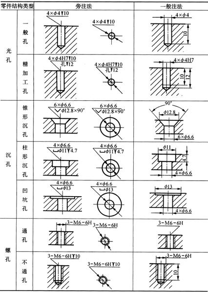 (二)结构孔的尺寸标注方法 表4-23列出了各种形式常见孔的尺寸注法。 表4-23 各种形式常见孔的尺寸注法(mm)