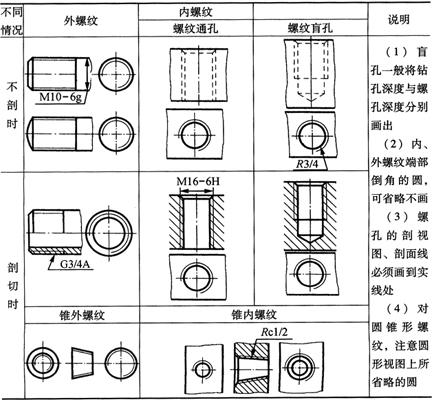 (三)螺纹及其连接的规定画法及标注 由于螺纹是采用专用机床和刀具加工,所以无需将螺纹按真实投影作图,可采用规定画法以简化作图过程,如表4-24和表4-25所示。 表4-24 内、外螺纹画法及标准螺纹注法(摘自GB/T4459.1-95)