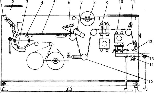 图2-8-14 连续滚筒式热成型-充填-封口机的热合装置示意图 1-热压辊 2-调节螺栓 3-支撑轴 4-支座 5--覆膜 6-成型塑片 7-主动辊 连续滚筒式热成型-充填-封口机的冲裁装置与间歇式相似。 |