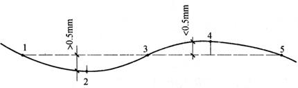 图7-29 平板仪测房屋的碎部点 2)对轮廓线为曲线的地物,如道路、河流、土地的边界等,如图7-30所示,应在转弯处适当选点。但一般测图规定,凡轮廓线在图上反映凸凹不超过0.5mm的,可将该段曲线当直线看待。反之,必须适当选择凸凹点作碎部点。如图中点2偏离13连线超过图上尺寸0.5mm,点2应作碎部点测出;但点4偏离35连线不超过图上尺寸0.5mm(或1∶500测图上小于1mm时),即可视345线为直线(此图为使学生看清这一关系,夸大作图),点4可不测定。实测时,选点立尺(俗称“跑点”),持尺人可根据比例尺大小,在实地目估这种凸凹程度,而确定是否选择为碎部点。例如施测一1∶1000的地形图,当凸凹点偏离不超过0.5×1000=500mm=0.5m时,该点即可舍去,不必测定。