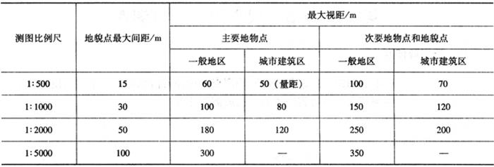 图7-30 平板仪测曲线地物的碎部点 3)独立的地物如大树、电线杆等,应选其中心点为碎部点。 2.地形(貌)点的选择 凡地形(貌)坡度及方向改变的地方,应选点测定。如坡脚、山峰顶、山脊、山谷、鞍部、断崖等起伏变化处,都要适当选择碎部点。选点时要特别注意断崖处立尺的安全。 平坦地区或地形无显着变化的地区,应根据视距要求,见表7-9,适当选择碎部点。如高差不大,不便勾绘等高线的地区,可在该地区测图中心,用小圆点表示测点,在点旁注出该点的高程。 表7-9 碎部点的最大间距和最大视距