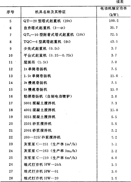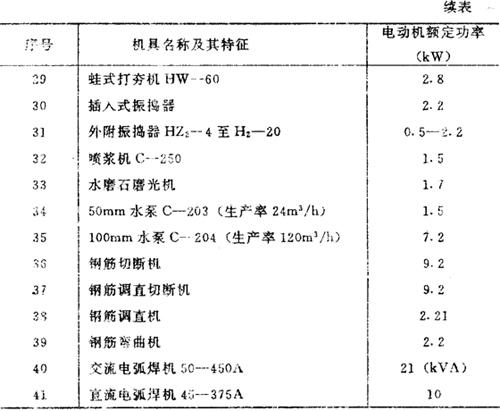 表9-10 施工机具电动机额定容量参数