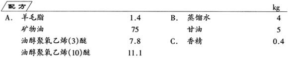 分别将A中和B中的全部组分混合,加热至75℃,得A组分和B组分。在搅拌条件下,将B组分加入A组分中,混合均匀,温度降至35℃时加入C组分香精,混合均匀,即成产品。
