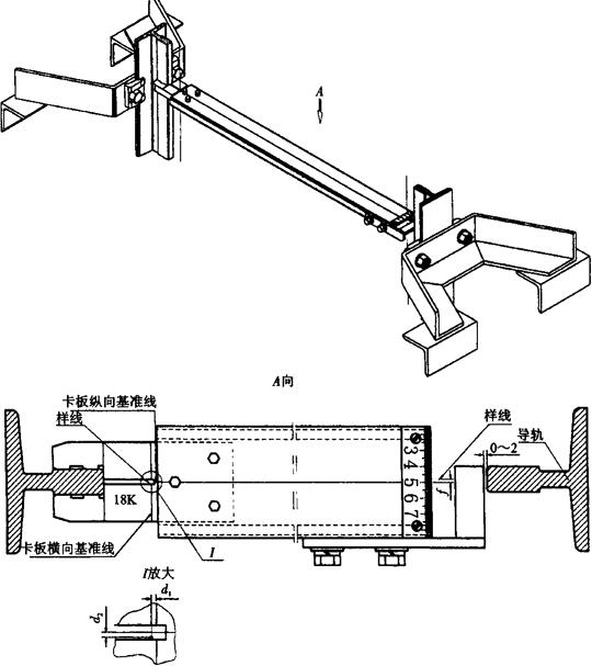 图4.5-8 卡板式校轨尺校轨示意 拧紧压板螺栓至弹簧垫圈平齐时,将卡板型校轨尺卡在导轨上,并且校轨尺卡板应顶紧导轨顶面,读取样线与校轨尺卡板上横向基准线的对中偏差d1。通过在导轨底面与导轨支架之间增减垫片(厚度为d1),使对中偏差d1在±0.5mm以内。 (5)调整导轨纵向垂直度误差,如图4.5-8中Ⅰ放大所示。 ①样线与纵向基准线的对中偏差d2在±0.5mm以内。 ②校正方法:拧紧导轨压板紧固螺栓半圈后用手锤敲击导轨,直至卡板上纵向基准线与样线重合,拧紧压板螺栓。 (6)调整导轨对向平行度误差及导轨距,如图4.5-8所示。 校正方法:两人合作,使用校轨尺在各校正部位测量,要求校轨尺刻度板与样线的对中偏差f符合表4.5-2要求。若导轨对向平行度误差超差,可在导轨支架与导轨底面间插入单边垫片调整;若导轨超差则重复上面步骤(4)的操作。 表4.5-2 对中偏差f的要求