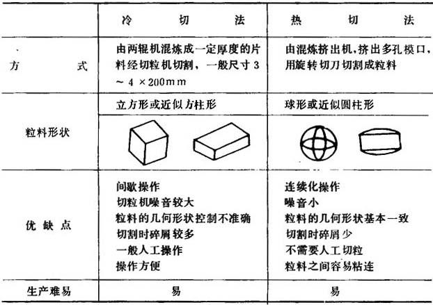 | 释义 | 造粒 通过计量、混和、混炼塑化的混和料制成供挤出、注塑等成型加工用的粒料的工序称为造粒。粒料的制造方法可分为冷切和热切两种。冷切法有片状和束状之分,而热切法则有空中热切和水中热切之分。就聚氯乙烯造粒的冷切法来说,是由两辊机先将原料混炼成一定厚度的料片,而后经切粒机切割成一定规格的粒料。不用料片而用挤出机挤出的细条也可。热切法是由混炼挤出机将混料以细条状的形式挤出口模后再经等长度的切割而成。这两种方法的特征见表3-4-1。 表3-4-1 两种造粒方法的特征