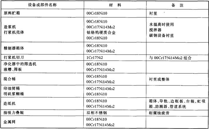 造纸的生产条件不像纸浆生产工艺介质那样具有严苛的腐蚀性,但为了生产出洁净的纸张和维修方便,不锈钢在造纸工艺过程中得到了广泛应用。实际应用状况见表2-22。