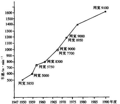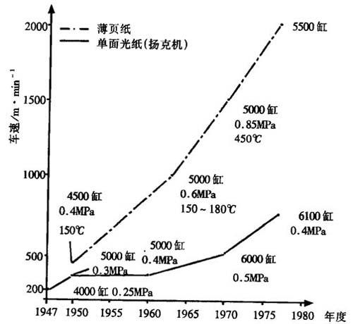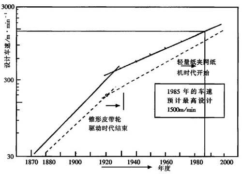 图11-1-2 40年代以来单缸纸机设计车速的变化