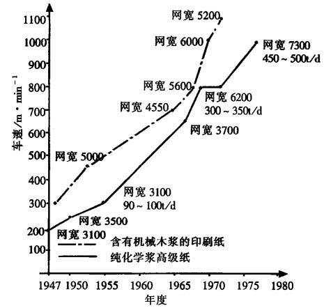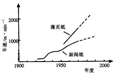 图11-1-5 新闻纸机与薄页纸机历年来的典型车速