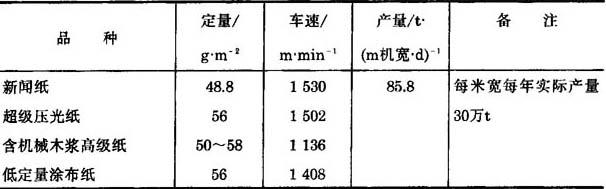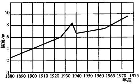 图11-1-6 100年来纸机宽度的变化 长网造纸机的幅宽自20世纪以来也在不断增长,但是由于纸机的价格几乎与纸机宽度的三次方成正比,因此纸机幅宽的增加便较为缓慢。如40年代至60年代的20年间仅增加了0.5m,平均每10年增加3.6%。但在60年代以后增加较快,至70年代的10年间增加了2m,即10年之间增加27%。图11-1-6为100年来纸机宽度变化的情况。 由于纸机速度不断的提高,纸机幅宽不断的增加,因此纸机的生产率有了很大的增加。表11-1-1为目前几种纸张的造纸机已经达到的生产率。 表11-1-1 几种纸张的造纸机理已达到的生产率