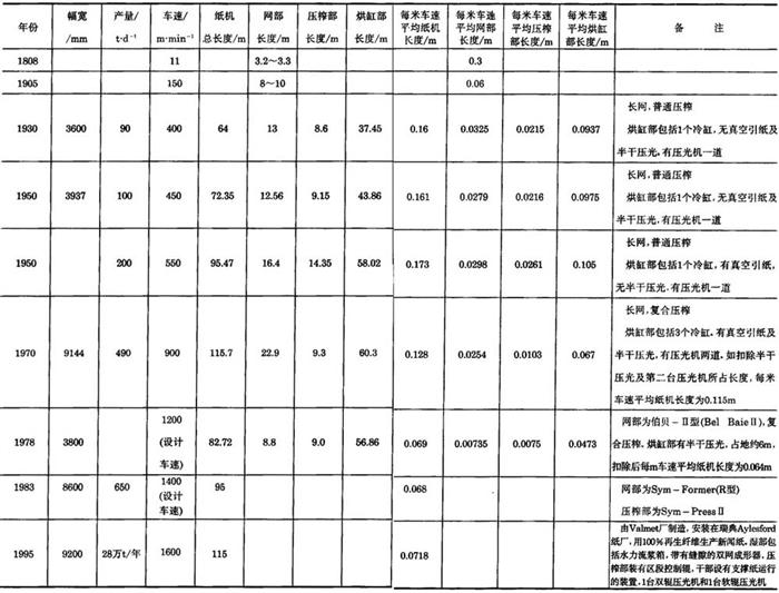 从每米车速平均纸机总长度和各分部的长度来看,30年代至50年代之间,并无多大变化。但自50年代至70年代末之间,却有了明显的下降,即每米车速平均纸机总长度下降了50%,平均压榨部长度下降了60%,平均烘缸部长度下降了50%。平均压榨部长度的下降是由于复合压榨的出现,平均烘缸部长度的下降是由于压榨部出口纸页水分的降低和各种辅助干燥装置的出现,以及改进了通风换气、装设了更为完善的供汽排水系统、采用了尼龙干毯等等,使干燥效率大幅度提高的缘故。但平均网部长度在夹网成形器未问世以前仅下降9%,直到1968年夹网纸机问世后,方始下降60%。 表11-1-2 170年来长网机及夹网机总长度及各部长度变化情况