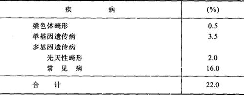 如表中所列,人类中染色体畸变的发病率为0.5%,各种单基因遗传病(不包括先天性红绿色盲)为3.5%,多基因遗传病中先天畸形为2%,常见病为16%;合计约22%的人患有遗传病或与遗传密切有关的疾病。即使除去多基因遗传病,确定由遗传所致的疾病也占人类的4%。因此,遗传病对人类健康影响较大,应作为遗传学与医学科学的一个重点研究对象。 |