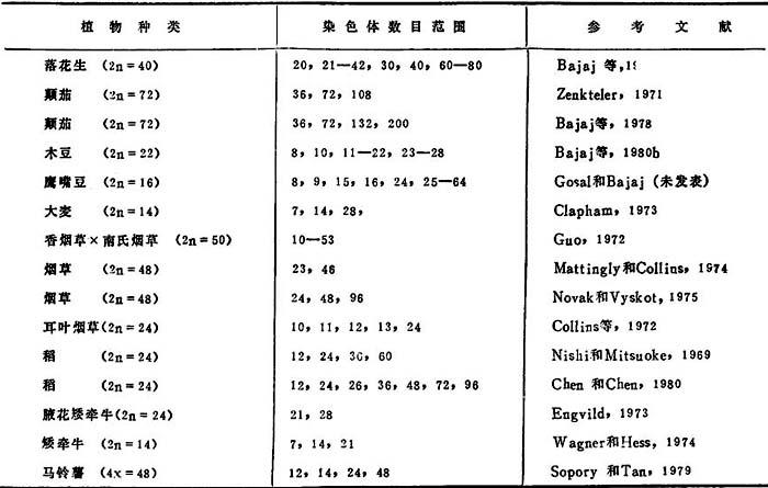 | 释义 | 遗传变异性的诱导 任何作物改良计划的成功,都依赖于基本群体中遗传变异性的程度。可是由于种质库日益枯竭,遗传资源在减少,在这点上,愈伤组织培养物是遗传变异性的丰富来源。用花药培养物不但可得单倍体,还能再生出不同倍数性水平的植株和突变体。表5-7概述离体花药培养得到染色体数的遗传变异性结果。 表5-7 花药的愈伤组织、原生质体和植株的染色体数目变化