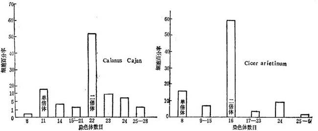 落花生和Arachis villosa、木豆和鹰嘴豆的花药愈伤组织显示广泛的遗传变异性(图5-8),如染色体数从单倍体到八倍体,还有大量非整倍体。因此,通过花药培养能得到合乎需要的植株,并列入育种计划。