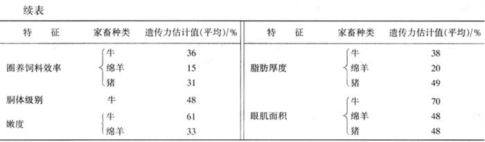表1-1-3 牛、绵羊与猪的生长与胴体特征的遗传力估计值