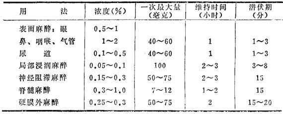 (二)邦妥卡因的麻醉效能比普鲁卡因强10~15倍,但毒性也大20倍。所以,其浓度和用量都要严格掌握。为预防中毒,麻药中宜加用适量副肾素,用法同普鲁卡因。 (三)邦妥卡因具有较强的粘膜穿透作用,故可用作表面麻醉药,应用后有引起局部粘膜血管扩张及充血的缺点。 (四)邦妥卡因中毒反应的症状和处理同普鲁卡因。 【适应症】 同普鲁卡因,还适用于表面麻醉。 【禁忌症】 普鲁卡因过敏的病人,也不宜用邦妥卡因。 【用法和用量】 详表2~3。临床成人一次极量以100毫克为限。禁忌静注。 |