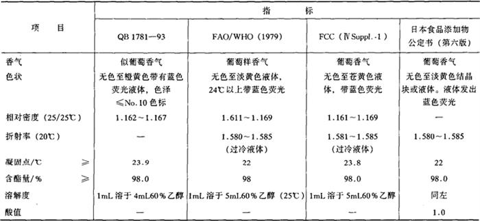 鉴别方法 (1)取本品0.1g,加盐酸溶液(1+40)10mL溶解,再加新配制的亚硝酸钠溶液(1+10)1mL和β-茶酚0.1g溶于氢氧化钠溶液(1+25)5mL中的溶液2mL,应产生橙红色沉淀。 (2)取本品1g,加10%氢氧化钾乙醇试液5mL,在水浴中加热5min,趁热加水5mL,冷却后加盐酸(1+3)4mL,应产生白色至灰白色沉淀。 毒理学依据 1.GRAS FEMA 2682;FDA 182.60。 2.ADI 0~1.5mg/kg(bw)(FAO/WHO,1994)。 使用 使用范围及使用量 (1)我国《食品添加剂使用卫生标准》(GB 2760-1996)规定:可按生产需要适量用于配制各种食品香精。 (2)实际使用参考:在食用香精中,它是葡萄香型的主体香料,也可以用于各种浆果、甜瓜、蜜香、柑橘、玫瑰、紫罗兰及酒用香精中。在最终产品中的用量为:酒,0.2mg/kg;糖果,20~50mg/kg;胶姆糖,可达2200mg/kg。 |