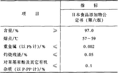 鉴别方法 (1)取本品的乙醇溶液(1+100)1mL,加硼酸钠溶液4mL(1+500)和2,6-二氯苯醌氯亚胺少许,摇混,即呈蓝色至靛蓝色。 (2)取本品的乙醇溶液(1+10)1mL,加甲醛-硫酸试液(取0.2mL甲醛与10mL硫酸混合,用时现配),溶液分成二层,在界面处呈粉红色。 毒理学依据 1.LD50 大鼠口服2.43~3.00g/kg(bw)。 小鼠口服1.20g/kg(bw)(雄性); 1.05g/kg(bw)(雌性)。 2.ADI 0~0.2mg/kg(bw)(FAO/WHO,1994)。 使用 水果贮藏期防腐剂。 1.使用注意事项 (1)邻-苯基苯酚在5mg/kg以上,能抑制微生物中胡萝卜素的合成;对微生物细胞壁具有非特异性的变性效应;抑制细胞中的NAO-氧化酶。 (2)邻-苯基苯酚既能抗霉菌,又能抗细菌,在水果贮藏期的防腐中主要是对霉菌起作用。 (3)邻-苯基苯酚与苯甲酸、山梨酸等防腐剂不同,它的抗菌作用随pH的升高而增强,即它的离子态的抗菌作用比分子态的抗菌作用更好。 2.使用范围及使用量 (1)我国《食品添加剂使用卫生标准》(GB 2760-1996)规定:用于柑橘保鲜,最大使用量1.0g/kg,残留量小于12mg/kg。 (2)实际使用参考: ①可用其0.5%~2%的钠盐溶液浸果。由于邻-苯基苯酚在碱性条件下效果更好,因此可预先将溶液用0.4%氢氧化钠调节pH至11.7,另可加适量优洛托品,以防果皮退色。也可将其加到包装材料中或制成果蜡应用。邻苯基苯酚含量为0.68%~2%。 ②通常,在水果中邻苯基苯酚的最高残留限量(MRL)为:苹果、柑橘、黄瓜、辣椒、菠萝、番茄,10mg/kg;李子、马铃薯,15mg/kg;胡萝卜、桃,20mg/kg;甜瓜、梨,25mg/kg。 ③邻苯基苯酚若与联苯、噻苯咪唑合用,效果更好。 |