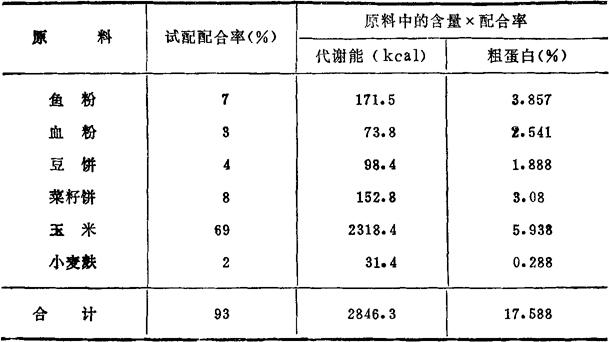 式中:X1——饲料中营养成分含量(%); X2——粪便中营养成分含量(%); Y1——饲料中氧化铬含量(%); Y2——粪便中氧化铬含量(%)。 2.放射性氧化铬(51Cr2O3)法 (1)饲料制备:将饲料原料粉碎,过40目筛,每100g饲料中加入5微居里的51Cr2O3,充分混合,使不均匀率在0.05以下,加入粘合剂,混匀成型,60℃烘干至含水量在10%以下。 (2)投饵与采集粪便:方法同前。 (3)样品分析:饲料与粪便中51Cr2O3的放射性强度用井型γ-闪烁探头及N500G型自动定标器测量(高压=220V;甄别域=10V;放大系数=1×1/4)。营养成分用常规方法测定。 (4)消化率计算:计算公式同上。其中:Y1=饲料中的51Cr强度(cpm/100mg),Y2=粪便中的31Cr强度(cpm/100mg) 三、饲料配方的设计依据 在设计饲料配方时应考虑下列问题: 1.根据养殖对象营养需要的研究结果制定各营养成分的标准。必要时并应作适当调整。 2.设计配方要依据饲料源的营养成分和价格,并应充分考虑饲料源的可靠性以及饲料源本身的特性,尽量因地制宜,就地取材。 3.养殖类型(池塘、网箱、流水等)是设计配方的一个重要依据,在高密度饲养条件下,应注意提高质量和营养的全面性,以加快鱼虾类的生长速度。 4.天然饵料的提供程度同样是制订配方的一个依据,在添补天然饵料的养殖条件下,维生素的添加可适当减免,以节约成本。 5.对饲料的安全性,即抗代谢因子对鱼虾类的危害应予充分考虑,该限制的应加以限制,选用国外饲料源时更应慎重。 6.对饲料添加剂应予以重视,应根据养殖对象的不同,慎重地选择有效的添加剂。 7.饲料是养鱼成本中支出最大的部分,制订配方时,应力求降低成本,提高经济效益。 四、配合饲料设计方法 配合饲料的设计方法有手工设计法和微机设计法。 1.手工设计法 手工设计法有代数法、图解法和试差法,这里只介绍较实用的试差法。所谓试差法,就是按饲料标准粗略地把所选用的饲料原料加以配合,计算其中营养成分,再与饲养标准相比较,对过多和不足的营养成分进行调整,以达到符合饲料标准的要求。举例如下: (1)选定某饲养对象的饲养标准,再根据饲养标准,首先确定主要营养成分的需要量,归纳于表5-21中。 表5-21