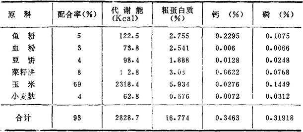 (4)与饲料标准相比进行调整:上述试配配方的代谢能与粗蛋白质均高,应该降低这两种营养成分原料的配合率,提高含量低的原料配合率。可用2%的小麦麸替代2%的鱼粉(代谢能下降17.6Kcal/kg,粗蛋白质下降0.814%),则所得配合率及四种营养成分含量归纳于表5-24。 表5-24