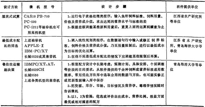 (5)用骨粉、蛋壳粉增加钙、磷含量,并加食盐。最终调整完毕的配方为: 鱼粉5%,血粉3%,豆饼4%, 菜籽饼8%,玉米69%,小麦麸4%, 食盐0.37%,骨粉1.63%,蛋壳粉7%, 合计 102%。 此配方的四种主要营养成分含量为:代谢能2828.7Kcal,粗蛋白质16.774%,钙3.5296%,磷0.6696%。与饲养标准对照,四种营养成分含量均在相应水平线上,因而基本附合设计要求。 从上例可知手工设计时,首先要选定饲养标准,查出所用原料营养成分,再考虑原料价格。在计算营养成分时,一般先计算蛋白质,再算能量,然后再算出钙和磷。因为原料中的钙和磷的含量通常达不到需要量,所以要以磷酸盐和钙盐来调整钙、磷的量。然后再计算氨基酸、粗脂肪、粗纤维、粗灰分等成分值。各种成分都调整到符合饲养标准之后,再检查价格,价格也基本适宜了,配方就算设计完成,可用于生产。 2.微机设计法:微机设计法是用微型计算机进行设计计算,其所依据的方法有的是试差法,有的是线性规划法。现将其方法与步骤简要列于表5-25。 表5-25 用微型计算机设计饲料配方的方法步骤简表