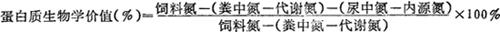 (2)蛋白质的生物学价值 蛋白质的生物学价值是衡量蛋白质在鱼体内的利用率和营养价值的一个指标。它是根据以下原理测定的:蛋白质在鱼类消化道中被消化吸收后,以氨基酸形式参加体内新陈代谢。一部氨基酸留存体内,构成体蛋白质;另一部分氨基酸经脱氨作用,形成碳水化合物,由尿排到体外。凡蛋白质所含必需氨基酸越完全,则合成体蛋白质的部分越多,经脱氨作用的部分越少。蛋白质的生物学价值一般按下列公式计算: