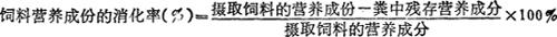 池塘环境条件下,以有机碎屑和藻类为饵料的鲤鱼,其饲料转换率不超过8%。据试验,即使用营养价值高的饵料,鲤鱼幼鱼的饲料转换率最高是35%。 (4)饲料的可消化成分和消化率 鱼类摄取的饲料中的营养物质,只有一部分被消化吸收,另一部分随粪便排出。被鱼类消化的那一部分营养物质叫做可消化营养物质,或叫可消化成分。饲料中可消化营养物质的多少,主要决定于饲料的种类、品种和所含营养物质的品质。 消化率就是饲料中某种营养物质被消化吸收部分占摄取该营养物质总量的百分数。如蛋白质消化率即为饲料中蛋白质被消化吸收量与摄取量的百分数(被消化吸收量可由摄取量减去粪中残存量而计得)。而在饲料中各种营养物质的消化率的平均值统称为饲料的消化率或叫总消化率。可用下式表示: