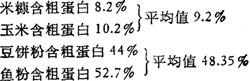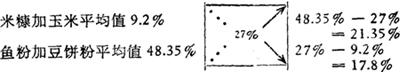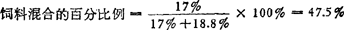 ③上面计算出的各差数分别除这两差数的和,就得到两组饲料混合百分比,其计算如下: 米糠+玉米=21.35%21.35%+17.8%×100%=54.53% 鱼粉十豆饼粉=17.8%21.35%+17.8%×100%=45.47%