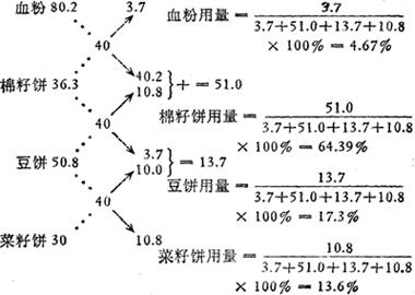 鱼粉和豆饼粉分别为45.47%/2=22.735% 方形计算法简单易学,适宜在饲料原料不多及营养指标少的情况下采用,其缺点计算其营养组成时,不能同时考虑多项营养指标。 例3,某温流水养鲤塘,要设计一组粗蛋白含量为40%的蛋白补充饲料配方,所用原料血粉含粗蛋白质80.2%,棉籽饼为36.3%,豆饼为50.8%,菜籽饼为30%,求各原料所占配方的百分比。 ①计算: