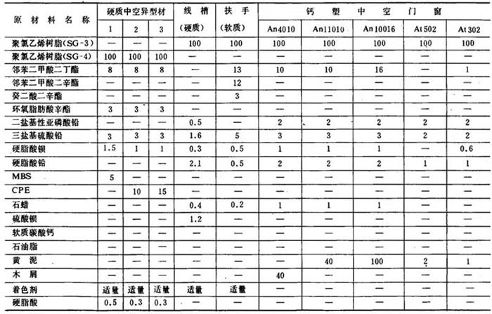 | 释义 | 配方及工艺条件 (一)配方 聚氯乙烯异型制品种类繁多:软质与硬质、抗冲击发泡与不发泡、高填充料与不加填充料等。由于使用中要求的不同性能,因此对原材料的选择和配方组成也应不同。 1.原材料选择 (1)树脂 应该根据制品所要求的强度及其用途以及定型时塑料熔体的刚性来选择树脂。树脂须呈疏松型,粒度要均匀,与助剂相容性好,分子量分布范围不能太宽,热稳定性高,流动性好。目前主要选用SG-3及SG-4型树脂。 (2)稳定剂 所用的稳定剂应根据树脂性能和型材用途而选择。成型户外使用的透明聚氯乙烯异型制品时,一般不宜采用锡稳定剂,而应采用耐晒的钡镉稳定剂。铅类稳定剂只用于不透明制品,稳定效果较好,价格也便宜,一般常用多种稳定剂并用。户外使用的异型制品应加入紫外线吸收剂及选择耐光,耐晒的稳定剂。 (3)增塑剂 应根据加工性能和制品用途来选择增塑剂品种和使用量,增塑剂与树脂相容性要好,迁移性小,来源容易,价格便宜。在平均气温低的地区使用的异型制品应采用较大量的耐寒增塑剂。 (4)填料 应根据制品的品种和用途而选择,填料一般要求填料的细度小和含水量低,同时要求考虑来源情况。异型制品配方组分中加入填料的主要效果是提高制品刚性和降低成本。目前采用最多的品种是软轻质碳酸钙,也有采用陶土、黄泥、木粉、电石渣等填料的。 (5)改性剂 由于硬聚氯乙烯中空异型制品的冲击强度比较低,不能满足某些使用要求。要获得抗冲击性能的制品可在聚氯乙烯树脂中配入相容的丁腈橡胶、MBS、CPE、ACS、EVA等树脂。选用的改性剂主要根据工艺上现有的设备和使用要求来确定。 生产聚氯乙烯异型制品采用的其它助剂如着色剂、润滑剂等与其它聚氯乙烯制品的要求相同,详见助剂一章。 2.配方举例 聚氯乙烯中空异型制品配方举例如表4-6-3所示。 表4-6-3 配方举例