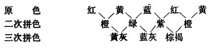 | 释义 | 配色 一切颜色都是由红、黄、蓝三种基本颜色所构成的。这三种最基本的颜色称为三原色。用着色剂进行配色时除了要注意原色外,还要注意色光才能配得鲜艳的色调。 当两种色料相配时,如果配比不同,就不能拼成多种颜色。现将主要的二次拼色和三次拼色的情况简列如下: