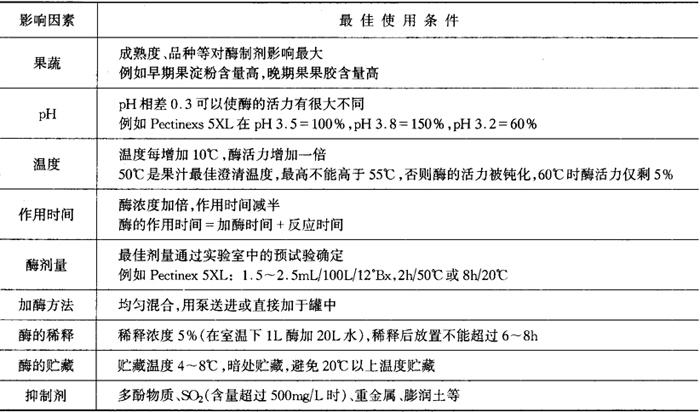 ③酶制剂应在正常pH范围内使用,当pH低于3.0时要考虑推荐剂量的上限或使用专用酶。另外多酚类物质含量较高,或在含有醇、SO2以及在基质中有其他酶制剂存在时都会抑制酶的作用或加速酶的失活。为避免这种情况出现,可在加酶前添加明胶或增加酶的剂量。 ④酶制剂可直接加于果蔬榨汁或浸汁中,也可加于经过加热杀菌的果蔬汁中。前者加入的酶制剂可与果蔬汁中的原有天然果胶酶协同作用,提高澄清效果。有时为了防止果蔬汁因氧化发生变色反应,或因微生物作用而引起发酵等腐败作用,可以先将果蔬汁迅速加热至80~85℃,经过灭酶杀菌,并冷却至55℃以后再加入酶制剂。 如上所述,酶制剂在果汁加工中的应用有各种影响因素,是一个非常复杂的课题。酶制剂的各种影响因素和使用参见表2-1-44,以供生产时参考。 表2-1-44 酶制剂的影响因素和最佳使用条件