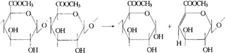 (二)果胶降解机理 果胶是高等植物细胞间质和细胞初生壁中的结构性多糖。果胶物质有原果胶、果胶和果胶酸三种形态。原果胶不溶于水,水解成为纤维素和果胶。果胶溶于水,具有一定的黏性,在果胶酯酶作用下变为果胶酸。果胶酸无黏性,对水的溶解度较低。 果胶主要构架是D-半乳糖醛酸(D-galacturonic acid),为a-1,4苷键,是具有15~30万分子质量的聚糖醛酸(Polyuronic acid)。用果胶酶分解果蔬汁中的高分子果胶,有两种酶系。一种是利用果胶酯酶(PE)和液化型聚半乳糖醛酸酶(endo-PG)的水解酶系,另一种是液化型果胶裂解酶系(endo-PL),作用机理见图2-1-8。